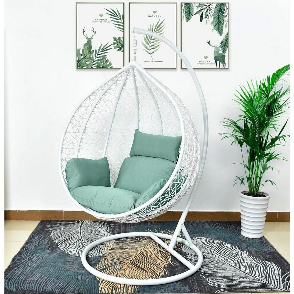 Размер корзины: H119хW107хD71 см Стойка: H2,0xD1,0 м, Каркас сталь. Материал плетения на корзине: искусственный ротанг белого цвета. Подушка цвет ментол. Ткань с водоотталкивающей пропиткой. Допустимая нагрузка: 120 кг.