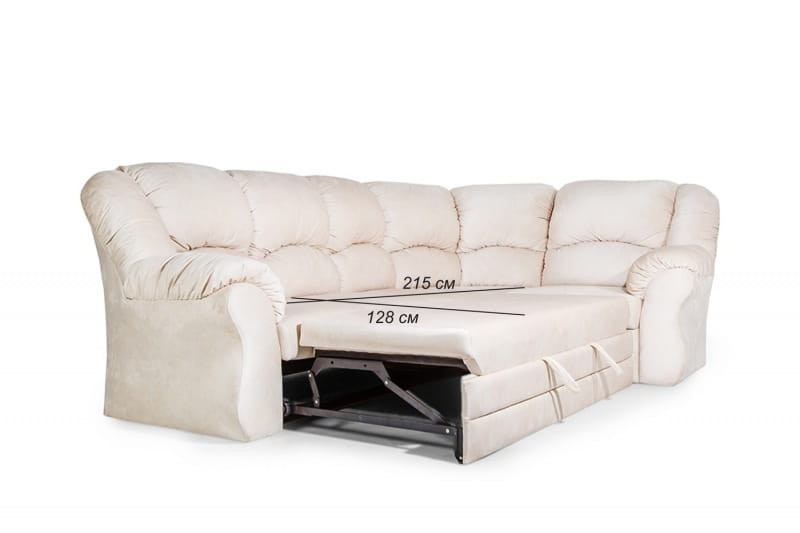 Особенности дивана: Удобный угловой диван с оригинальным дизайном. Имеет полноценное спальное место, на котором с комфортом смогут разместиться два человека. Механизм трансформации максимально удобен и прост в эксплуатации. Наполнение дивана: каркас - сосна (сухое дерево), ППУ, синтепон, термовойлок, пружина змейка, синтепух.