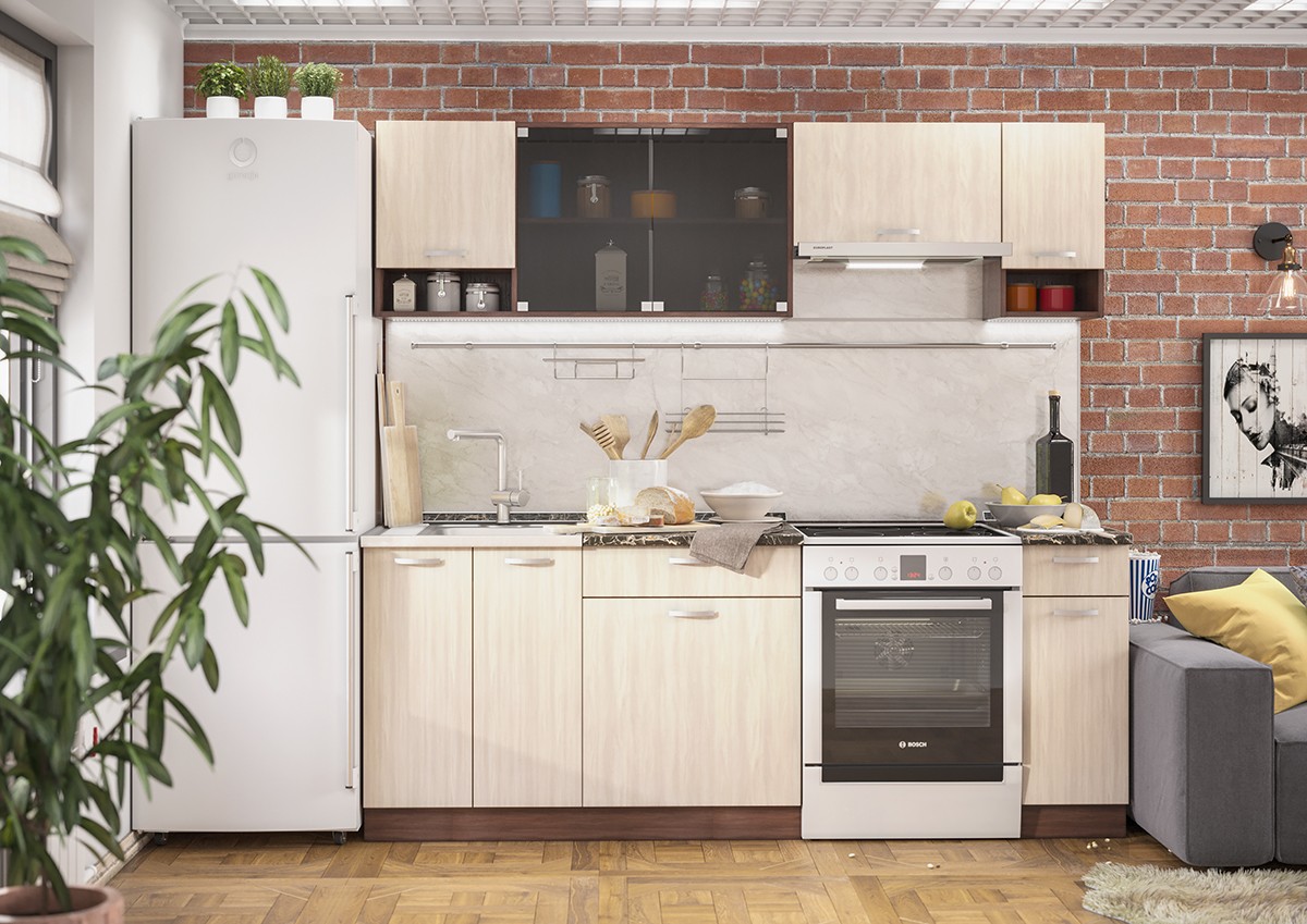 Кухонный гарнитур Зарина - сочетание открытых и закрытых полок с темными тонированными стеклами, и стильной черной столешницей наполняет кухню особой атмосферностью.